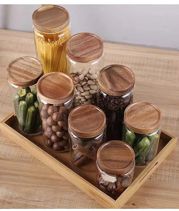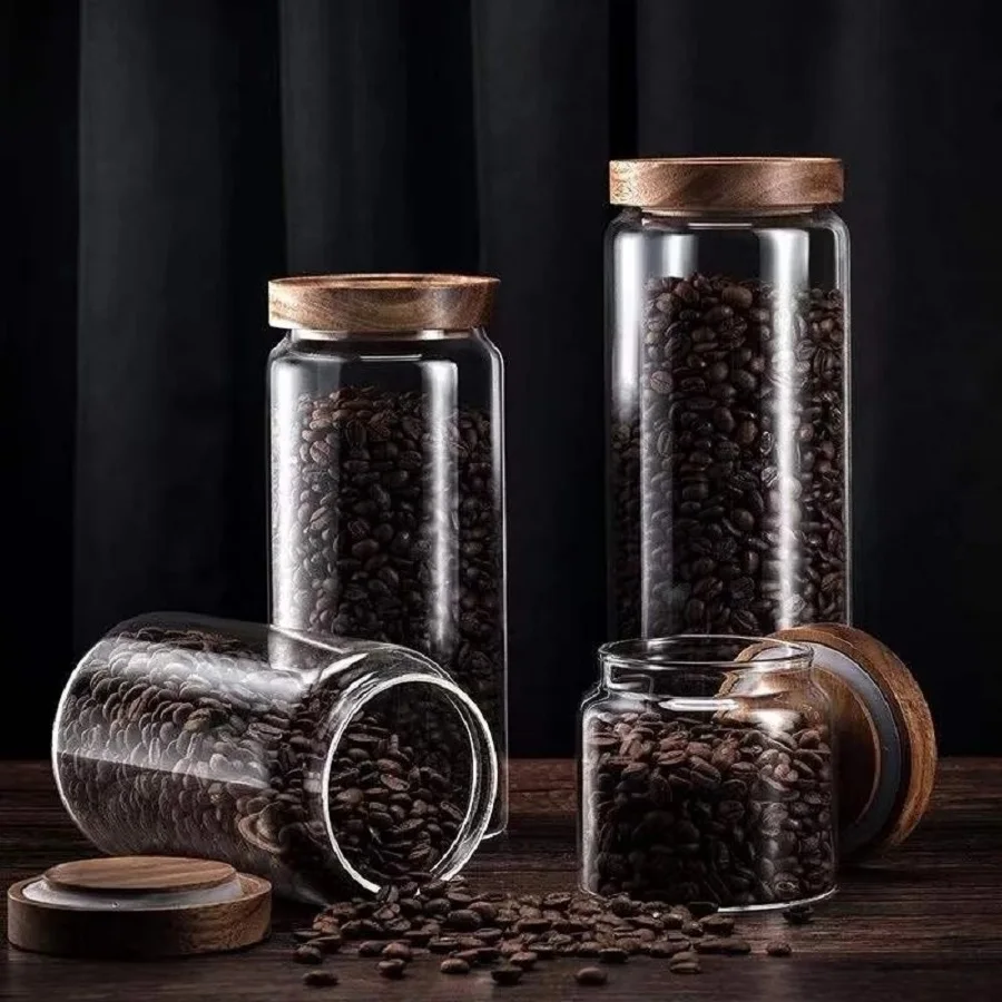 1PCS Vazio Vasilha De Vidro Transparente Casa Cozinha Recipiente De Armazenamento De Alimentos Frascos Potes Com Tampas De Madeira Herméticas Dispensador De Frasco Para Café Feijão Chá Açúcar Frutas Secas Porcas Doces 450ML/15oz 750ML/25.4oz 1000ML/33,8 onças/1500ML/50,7 onças